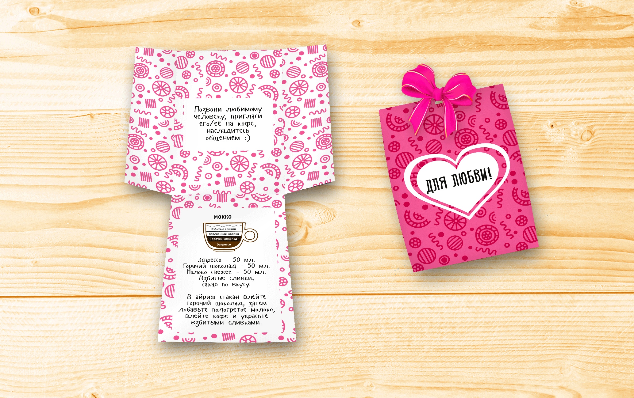 "Позвони любимому человеку, пригласи его/её на кофе, насладитесь общением" - пожелание в этом романтичном конверте. Также внутри - рецепт кофе Мокко и 20 г зернового кофе Honduras SHG с цветочными и карамельными нотками.