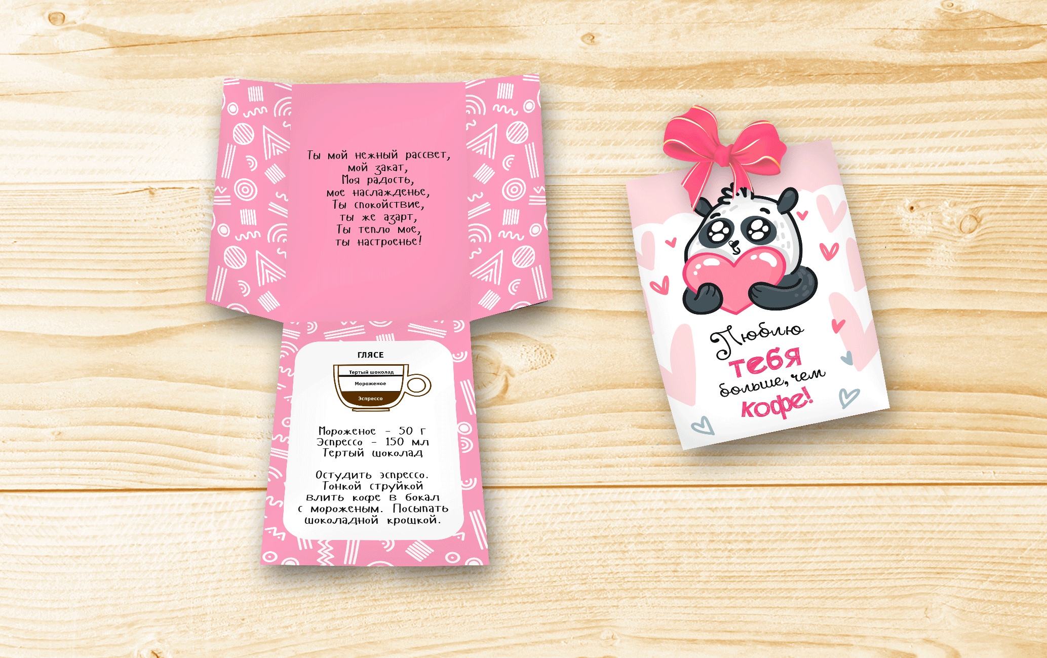 "Ты - мой нежный рассвет, мой закат. Моя радость, мое наслажденье. Ты - спокойствие, ты же - азарт. Ты - тепло мое, ты - настроенье!" - стихи в этом романтичном конверте. Также внутри - рецепт кофе Глясе и 20 г зернового кофе Brazil Santos.