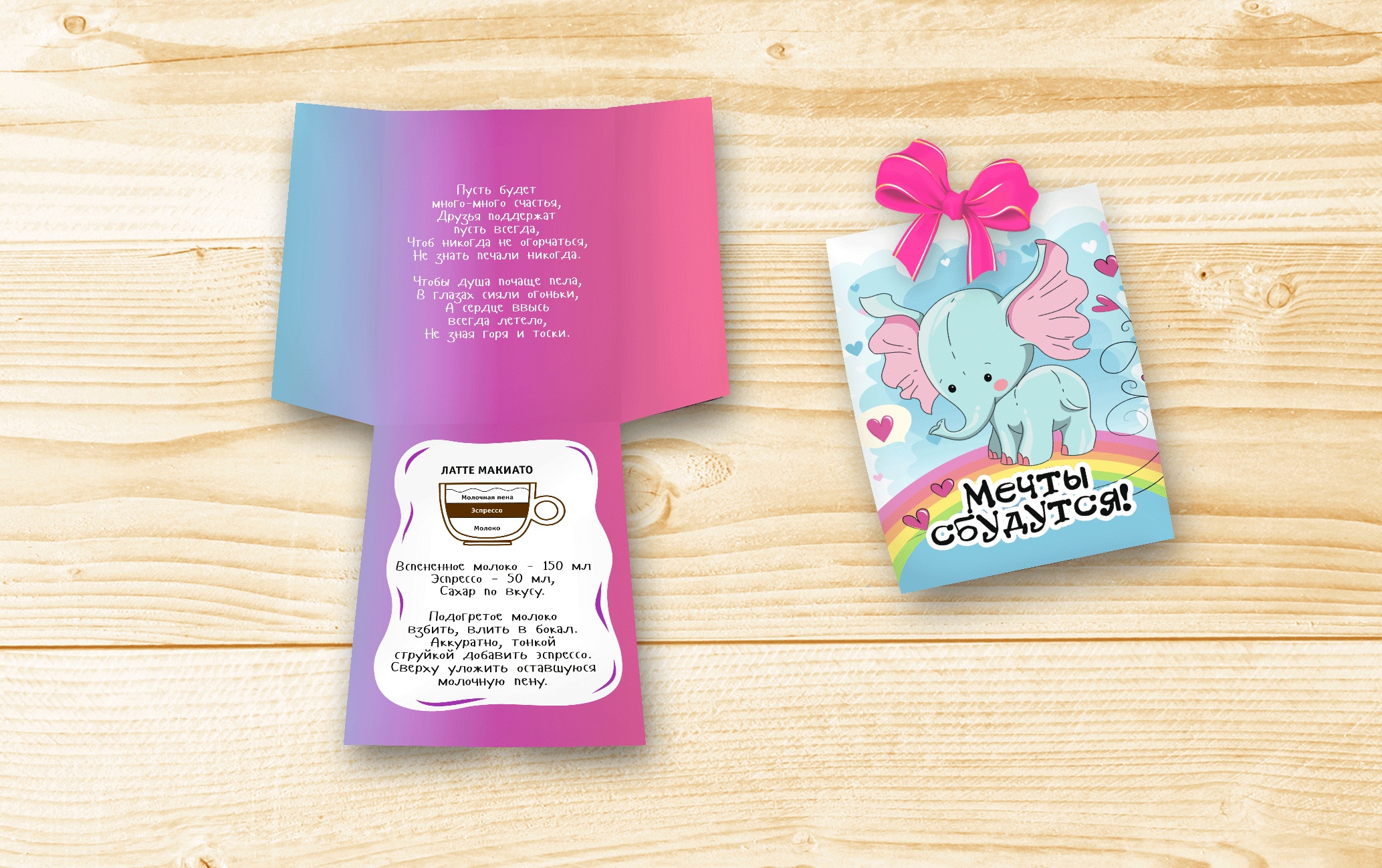 Этот милый веселый конверт вновь дарит веру в мечты! Внутри - рецепт кофе Латте макиато, вдохновляющие пожелания и 20 г зернового кофе Brazil Santos.