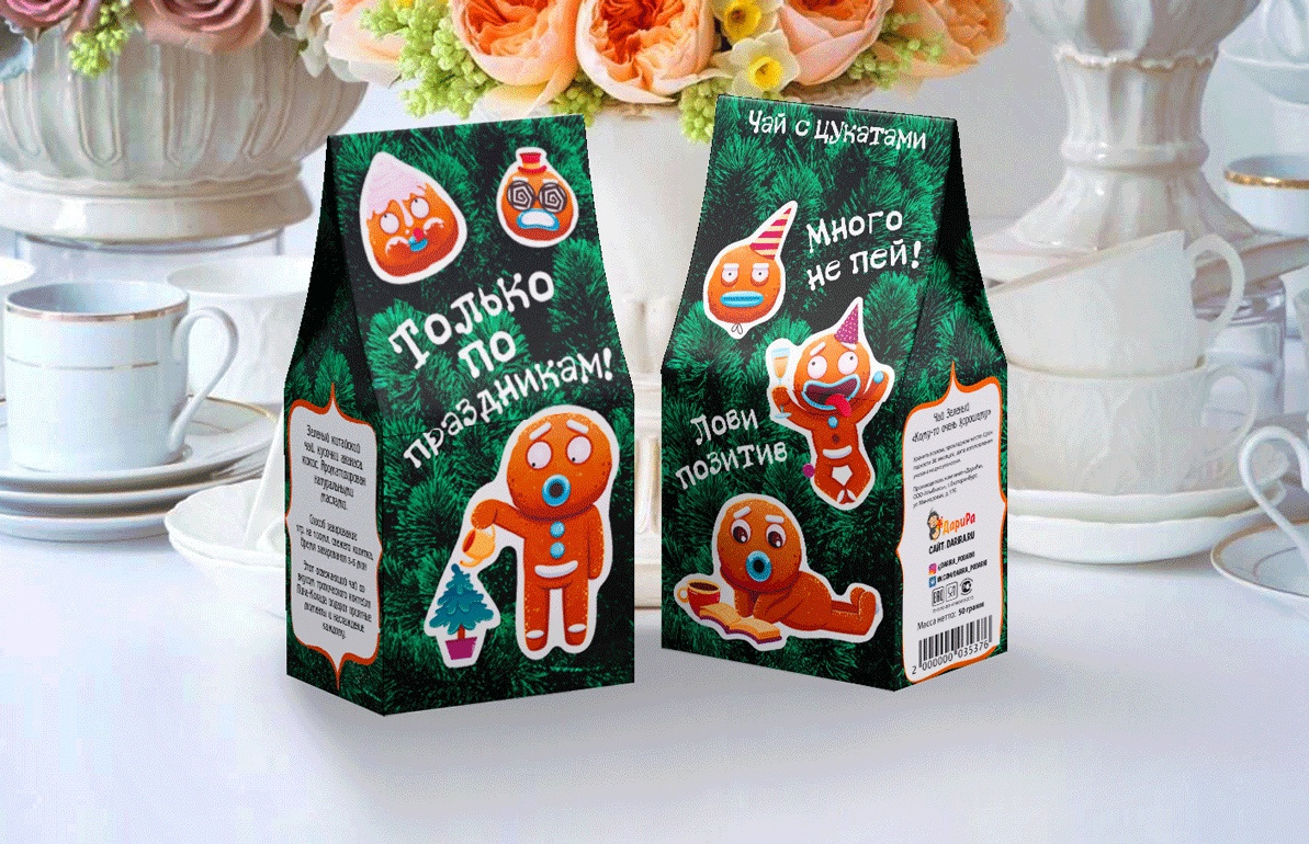 Этот зимний чай с клюквой и шоколадом подарит бодрость и хорошее самочувствие в Новогодние праздники. На обороте - пожелания: "много не пей", "лови позитив!"