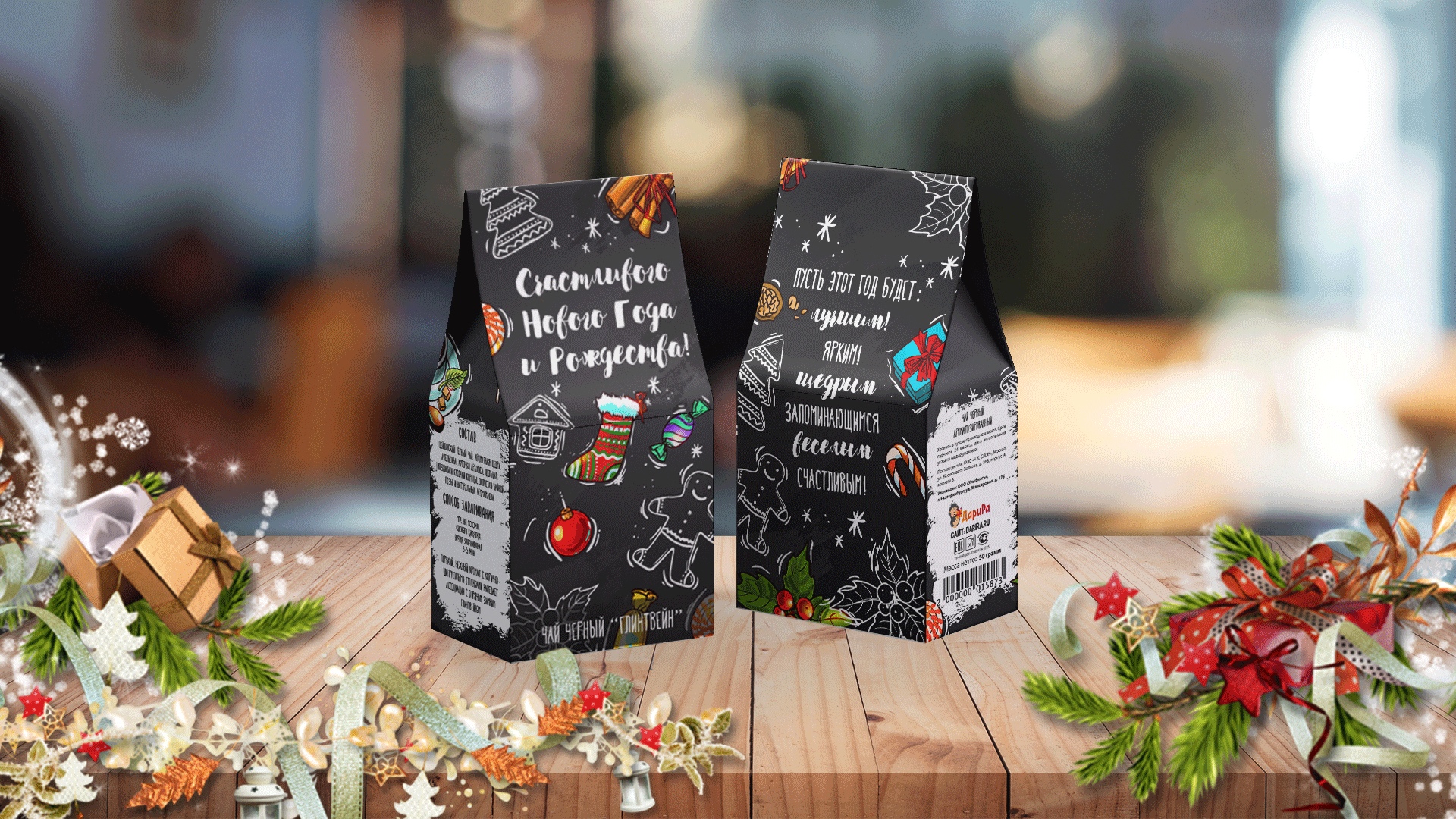 Черный чай <<Глинтвейн>>. Этот чай с цукатами, гвоздикой и корицей наполнит уютом зимний вечер и подарит ощущение праздника. Стильный, яркий дизайн и пожелание на обороте: "Пусть этот год будет лучшим, ярким, щедрым,