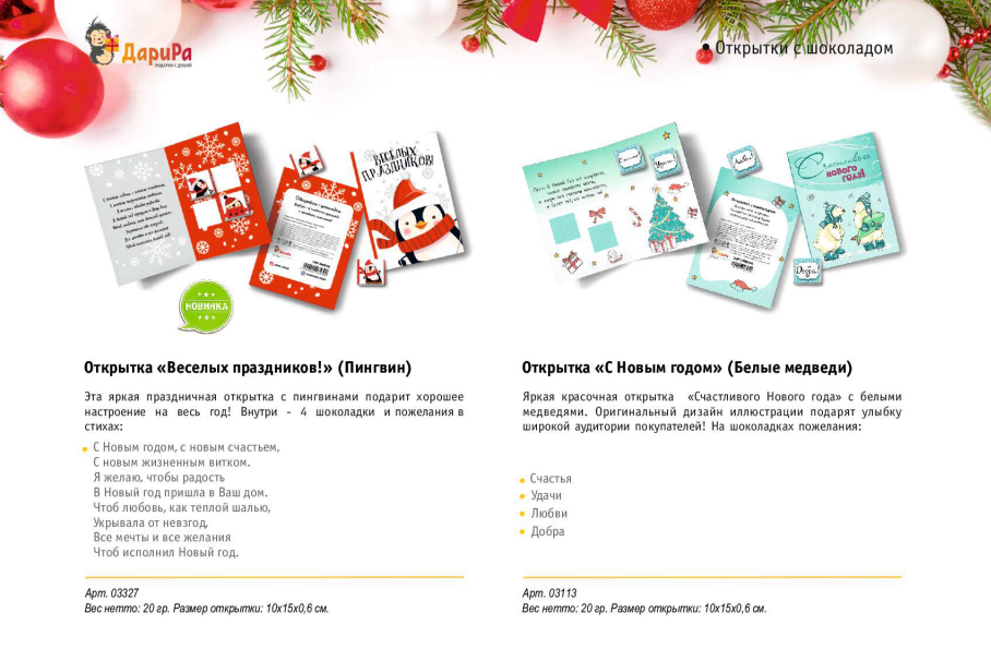 Внутри каждой открытки 4 плиточки молочного шоколада (по 5 грамм).