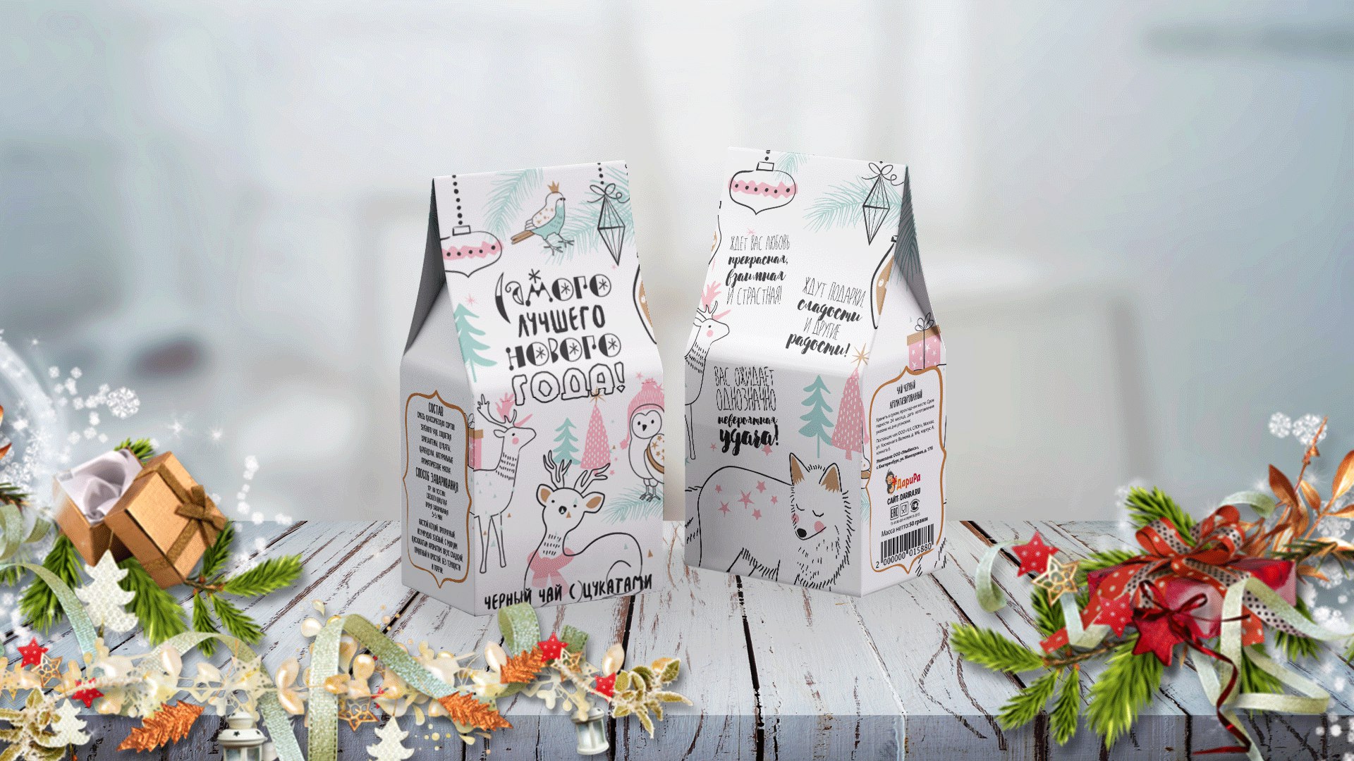 Черный чай с мандарином, шоколадом и кокосом. Подарит сказочное новогоднее настроение, передаст тепло и заботу. На обороте - приятные предсказания: "Ждут подарки, сладости и другие радости!", "Вас ожидает однозначно невероятная удача!"