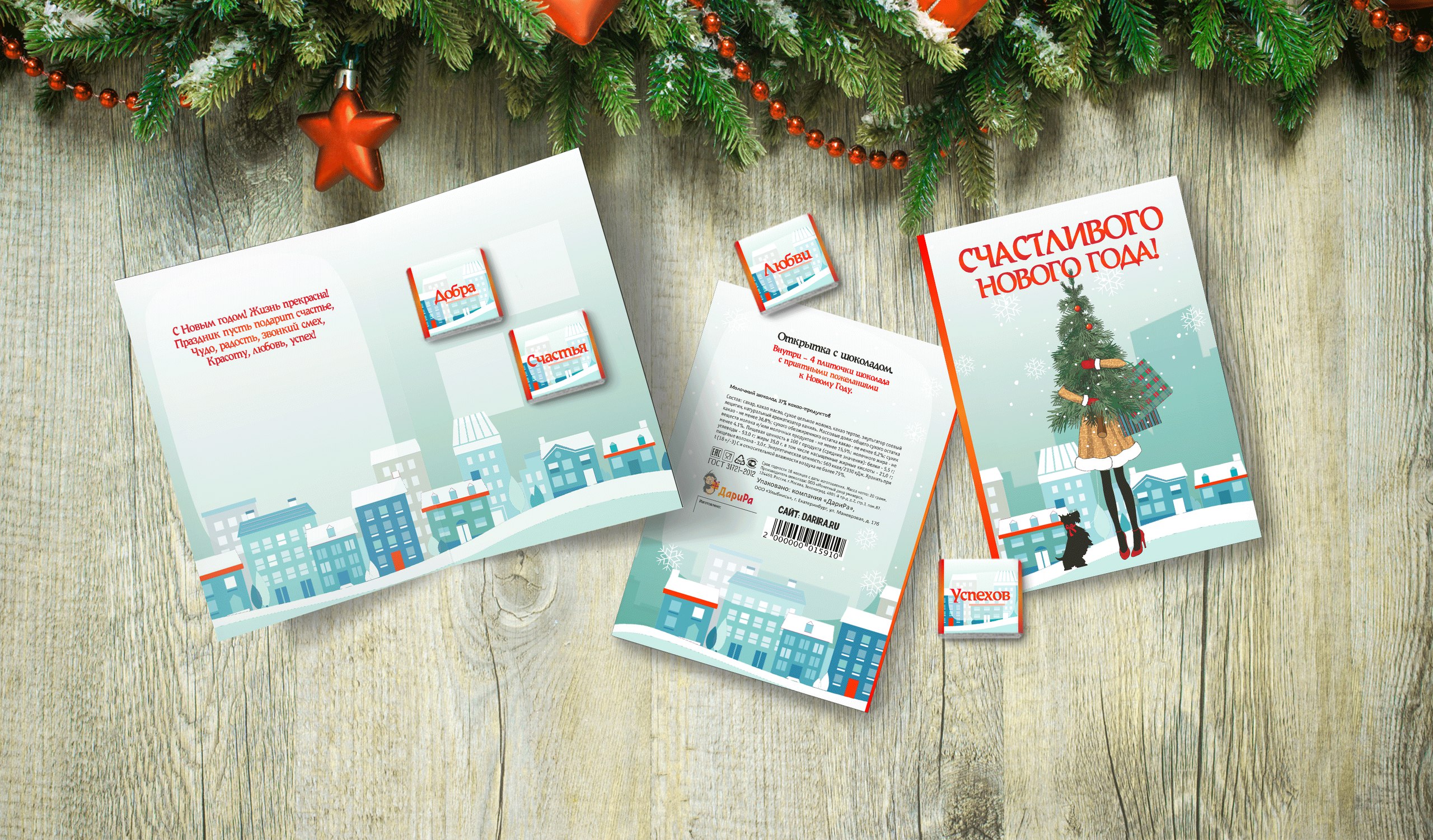 Внутри каждой открытки 4 плиточки молочного шоколада (по 5 грамм).