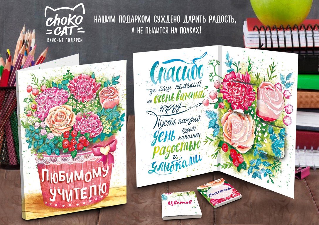 Яркие и современные, веселые и стильные, милые и нежные - все это открытки Chokocat! Каждая отличается оригинальностью и вниманием к деталям. Внутри добрые пожелания и 4 молочных шоколадки по 5 грамм с иллюстрациями на этикетках. 18 видов дизайна, 36,8% какао.